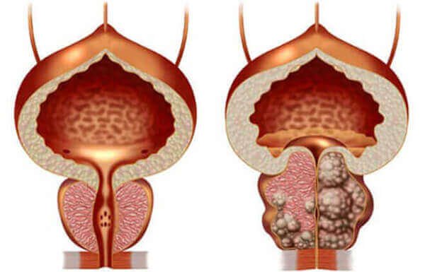 Majtas: prostatë e shëndetshme. Djathtas: adenoma e prostatës